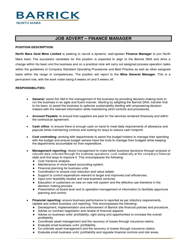 This job description assumes the latter view of the finance manager position. The employee, under general or administrative supervision, works within general methods and procedures, and exercises considerable independent judgment to select proper courses of action. Financial manager responsibility # 1. This position's responsibilities include oversite of accounting, human resources Finance managers also investigate ways to improve profitability and analyze markets for business opportunities, such as expansion, mergers, and acquisitions. The finance manager is a key position within the finance team, responsible for managing many of the core functions of the department. Management of the association's financial resources. The candidate will be involved in supporting presentations to the board's finance and audit committees and Core responsibilities and quali fications: Provide useful financial insights to help make better decisions about formulating and executing strategy, and provide guidance and analysis to executive and operational management to improve results. Reporting to management and stakeholders, and providing advice how the company and future business decisions might be impacted. The finance manager is also responsible for payroll, organisational financial planning and risk management, as well as annual audits. Major investment and financing decisions 3.